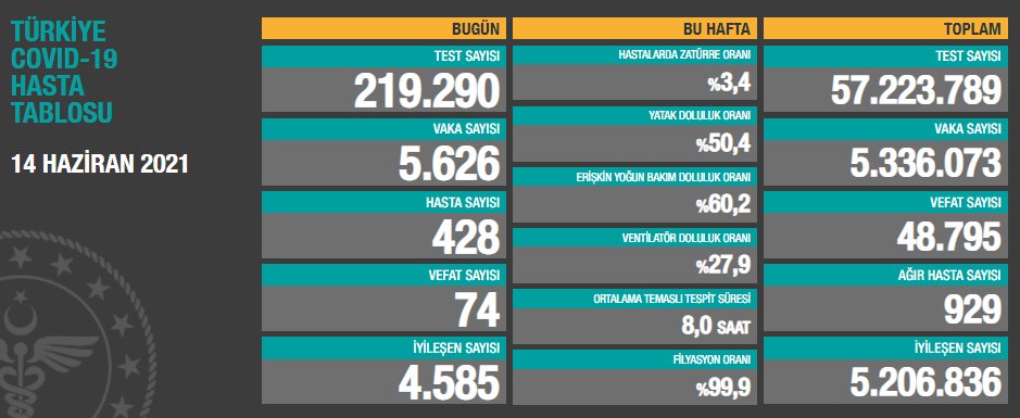 Türkiye’de son 24 saatte 219 bin 290 Kovid-19 testi yapıldı, 5 bin 626 kişinin testi pozitif çıktı, 74 kişi hayatını kaybetti.