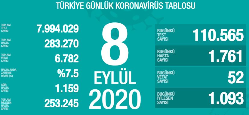 Sağlık Bakanı Koca, “Bugün 110.000’den fazla test yapıldı ve 1.761 yeni hasta tespit edildi. Ağır hasta sayımız artmaya devam ediyor. Kayıplarımız can yakıyor. Bu durumu durduracak olan birlikte tedbirlere uymaktır. Güç birlikte tedbirde.” dedi.