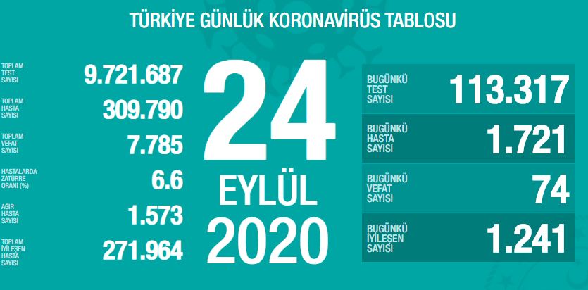 Türkiye’de son 24 saatte 113 bin 317 Kovid-19 testi yapıldı, 1721 kişiye hastalık tanısı konuldu.