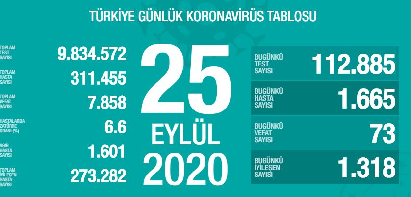 Türkiye’de son 24 saatte 112 bin 885 yeni tip koronavirüs (Kovid-19) testi yapıldı, 1665 kişiye hastalık tanısı konuldu.