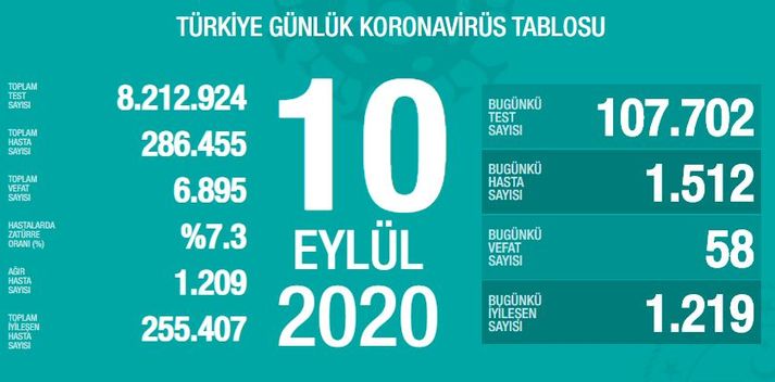 Türkiye Günlük Koronavirüs Tablosu, “covid19.saglik.gov.tr” adresinden paylaşıldı. Güncel verilere göre, bugün 107 bin 702 test yapıldı, 1512 kişide Kovid-19 tespit edildi.