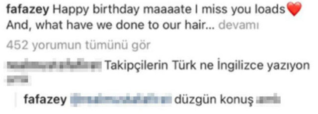 Farah Zeynep Abdullah’a bir takipçisi, “Takipçilerin Türk, ne İngilizce yazıyorsun a..” şeklinde küfürlü bir yorum yaptı.