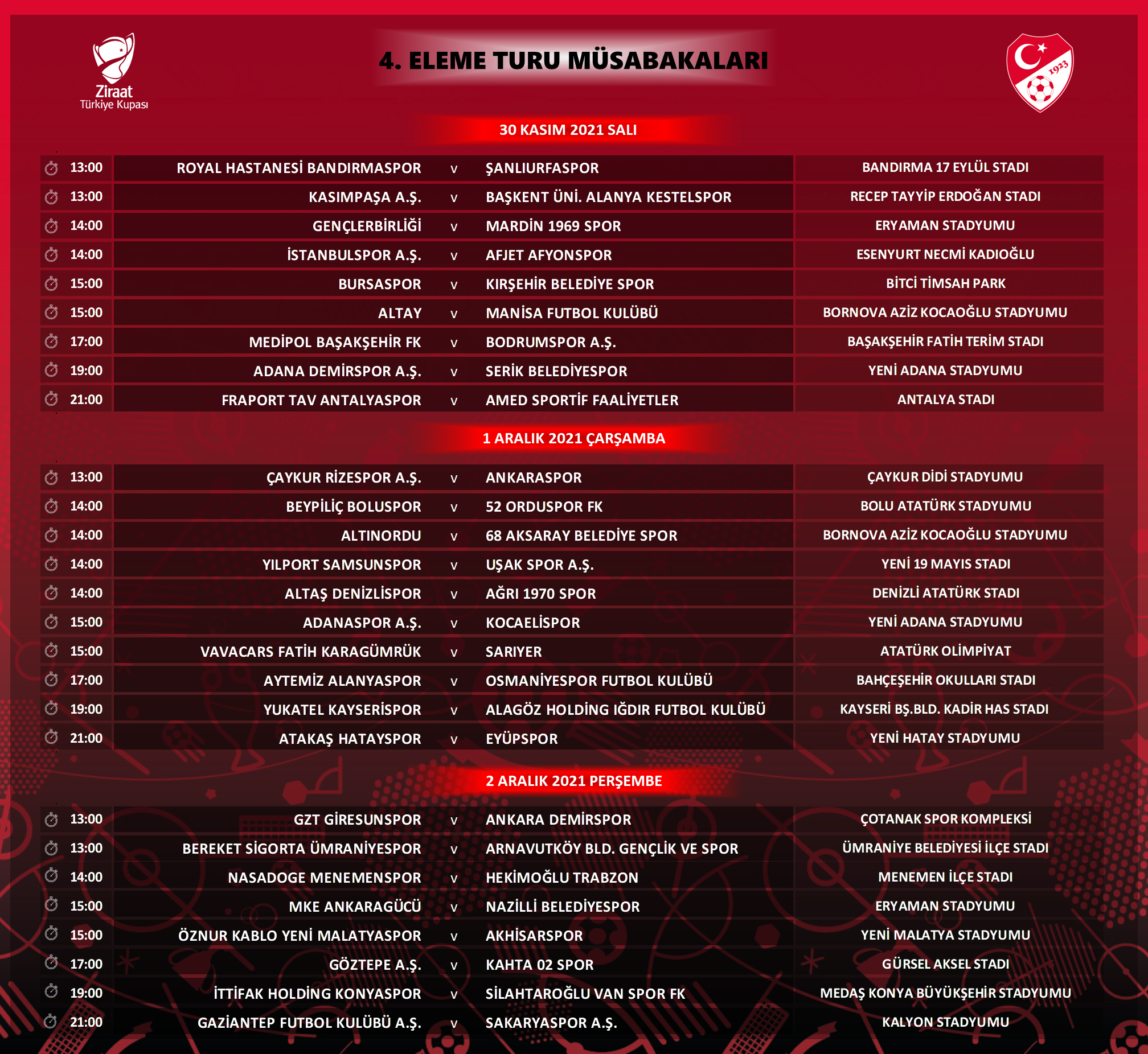 Türkiye Futbol Federasyonundan yapılan açıklamaya göre, kupada 4. tur maçlarının programı şöyle: