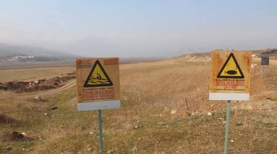 Metrelerce suyun çekildiği nehir, adeta ufak bir dereye döndü. Nehir havzası kenarına zamanında yerleştirilen ‘Bu alanda avlanmak, yüzmek ve suya girmek yasaktır’ yazısından bile artık su görülemez hale geldi.