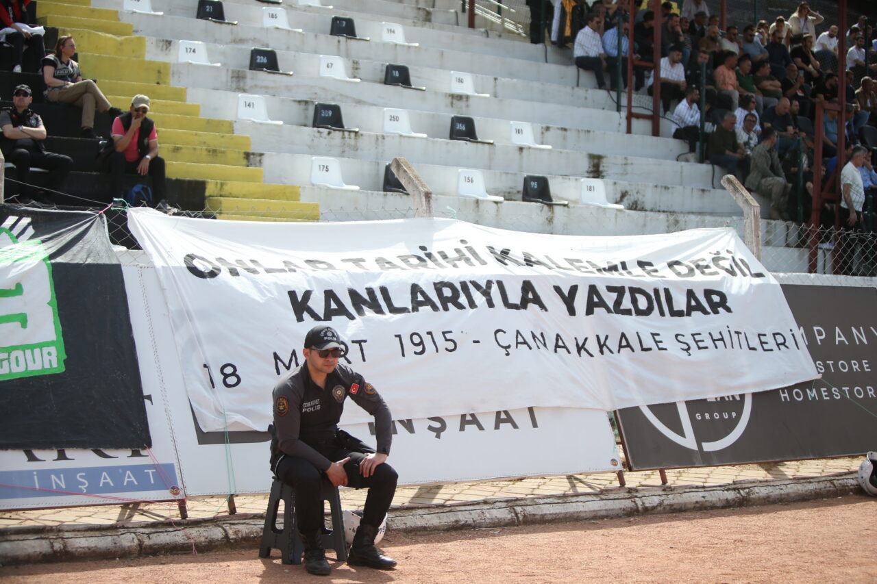 Bursasporlu taraftalar Kuşadası maçında anlamlı bir pankart açtı. Yeşil beyaz sevdalıları 18 Mart’ın yıldönümü nedeniyle açılan pankartta, “Onlar tarihi kalemle değil kanlarıyla yazdılar. 18 Mart Şehitleri” cümlesine yer verdi.