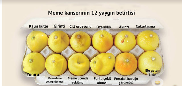 Fotoğrafta, ele gelen kitle, kızarıklık, girinti, meme ucunda sıvı sızıntısı, çukurlaşma, meme ucunun içeri çekilmesi gibi farklı belirtiler bir düzine limonla gösteriliyor.