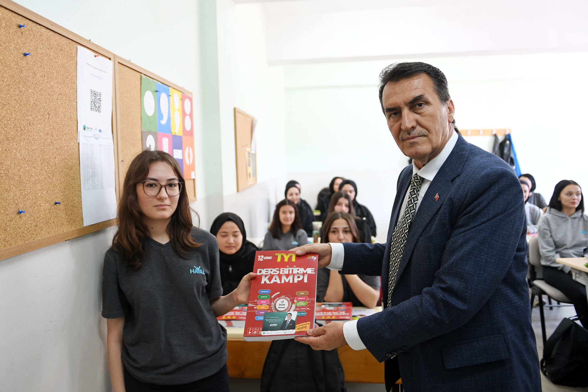 TYT ve AYT Ders Bitirme Kampı formatında hazırlanan kitap setlerini Hasan Ali Yücel Anadolu Lisesi’nde öğrencilere dağıtan Başkan Dündar, “Destek bizden, başarı sizden” mesajı verdi. Osmangazi Kaymakamı Ali Partal ile birlikte öğrenci ve öğretmenler ile bir araya gelen Başkan Dündar, lise öğrencilerinin geleceğini şekillendirecek sınavlar öncesinde katkı sağlamaya çalıştıklarını söyledi. Başkan Dündar, “Ülkemizin yarınları olan gençlerimize, eğitimleri süresince katkı sağlamayı görev kabul ediyoruz. Şimdiye kadar olduğu gibi bundan sonra da gençlerimizin yanında olacağız, her türlü desteği vereceğiz. Öğrencilerimize ne kadar iyi şartlar sunarsak, başarıları da o kadar büyük olur. Tüm öğrencilerimize rabbimden zihin açıklığı diliyorum.” dedi.