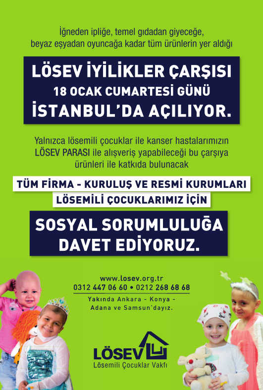 Öte yandan LÖSEV tüm kamu ve özel sektör kurumları ile hayırseverleri göreve çağırdı. İlanlar ve sosyal medya aracılığı ile yapılan çağrıda; “İğneden ipliğe, temel gıdadan giyeceğe, beyaz eşyadan oyuncağa kadar tüm ürünlerin yer aldığı LÖSEV İyilikler Çarşısı 18 Ocak Cumartesi Günü açılıyor. Yalnızca lösemili çocuklar ve kanser hastalarımızın LÖSEV PARASI ile alışveriş yapabileceği bu çarşıya ürünleri ile katkıda bulunacak tüm firma- kuruluş ve resmi kurumları lösemili çocuklarımız için sosyal sorumluluğa davet ediyoruz” denildi.