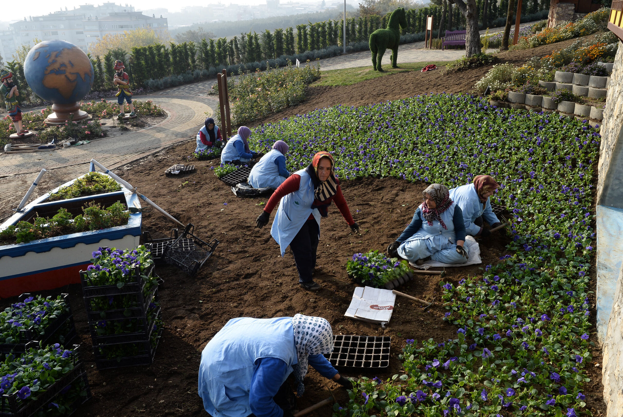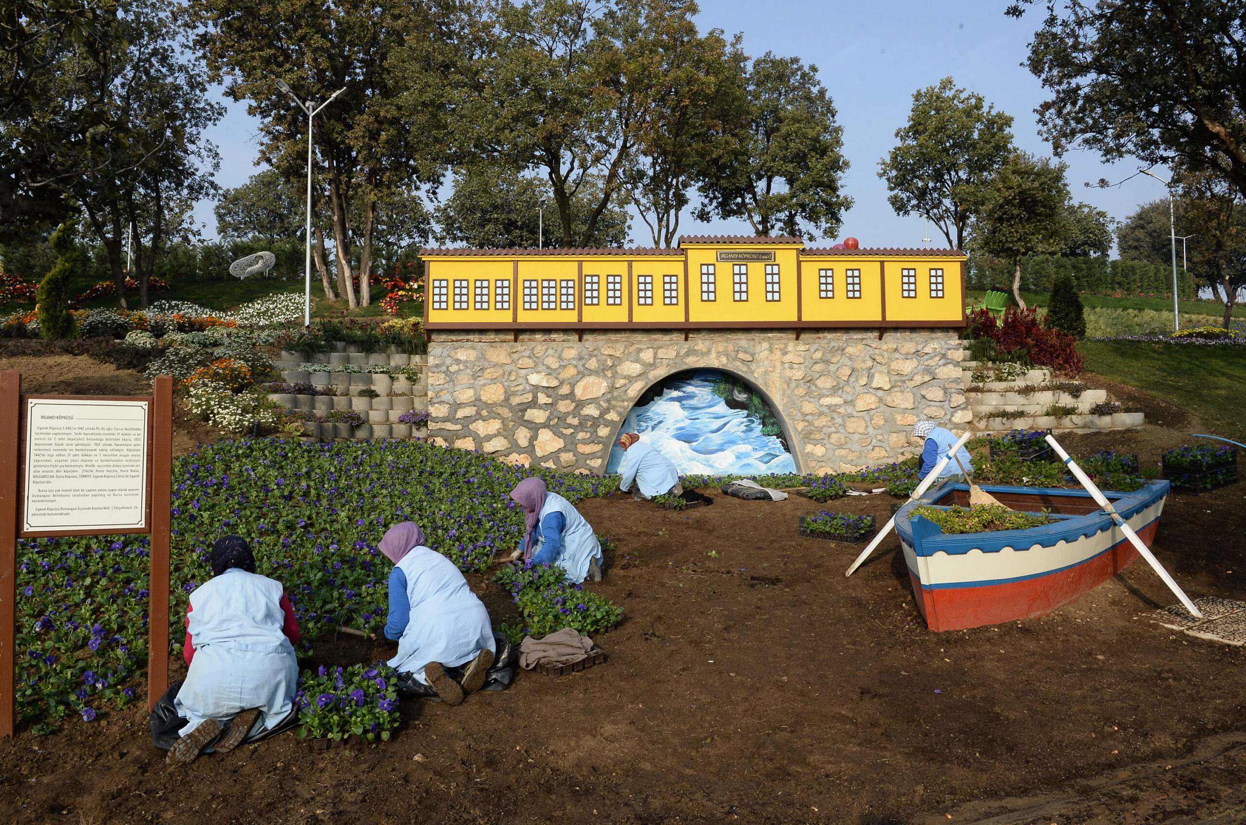 Çiçeklerin dışında, Bursa’nın simge yapılarından Irgandı Köprüsü, Somuncu Baba Fırını ile Hacivat-Karagöz, Zürafa, Sincap, Kuğu, müzik enstrümanları gibi 20 farklı figürün bulunduğu 6 bin metrekarelik tematik parkta kış çiçeklerinin ekimi yapılıyor.