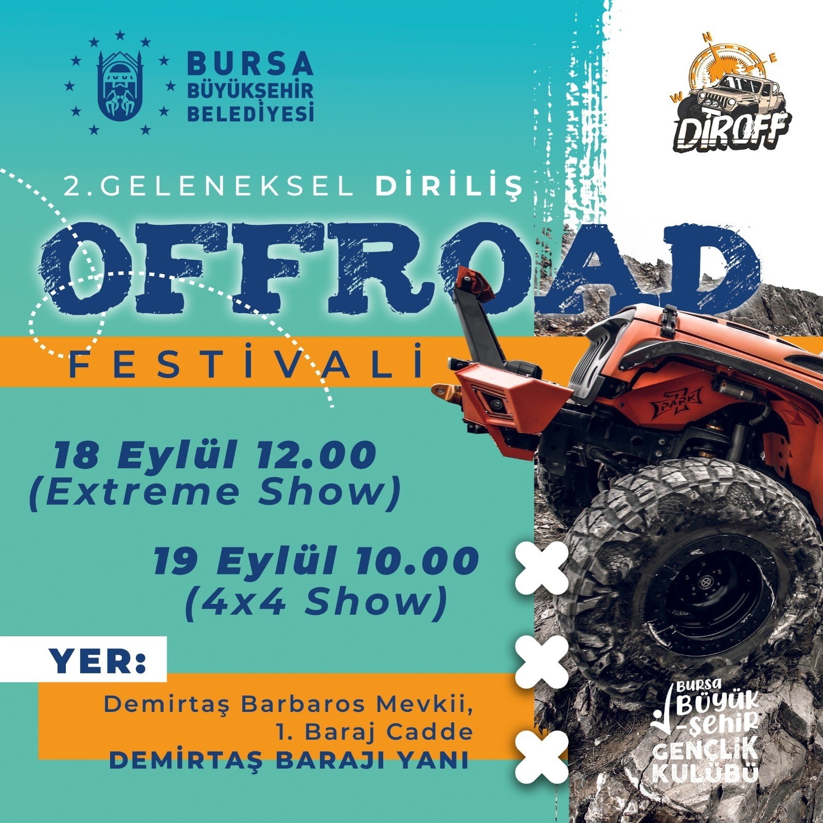 Bursa’nın gelişen yönünü turizm olarak belirleyen ve bu hedef doğrultusunda çalışmalarını sürdüren Büyükşehir Belediyesi, off road ve kamp tutkunlarını Bursa’da buluşturacak. Gençlik ve Spor Hizmetleri Dairesi Başkanlığının koordinasyonunda Diriliş Off Road Spor Kulübü işbirliğiyle hazırlanan “Off Road Festivali ve kamp etkinliği”, 18-19 Eylül 2021 tarihleri arasında Demirtaş barajı yanında yapılacak. Türkiye genelinden yaklaşık 40 kulübün ve 150 aracın katılacağı etkinlikte, çeşitli engellerle zorlaştırılmış ağır parkurlarda 4×4 araçlarla macera tutkunları engelleri aşmak için mücadele verecek. Nefes keseci ve adrenalin dolu anların yaşanacağı festivale, tüm halkımız davetlidir.