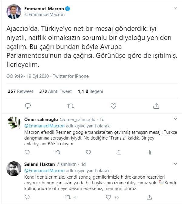 Macron, Doğu Akdeniz ile ilgili attığı Türkçe tweette şu ifadelere yer verdi: ” Ajaccio’da, Türkiye’ye net bir mesaj gönderdik: iyi niyetli, naiflik olmaksızın sorumlu bir diyaloğu yeniden açalım. Bu çağrı bundan böyle Avrupa Parlamentosu’nun da çağrısı. Görünüşe göre de işitilmiş. İlerleyelim.”