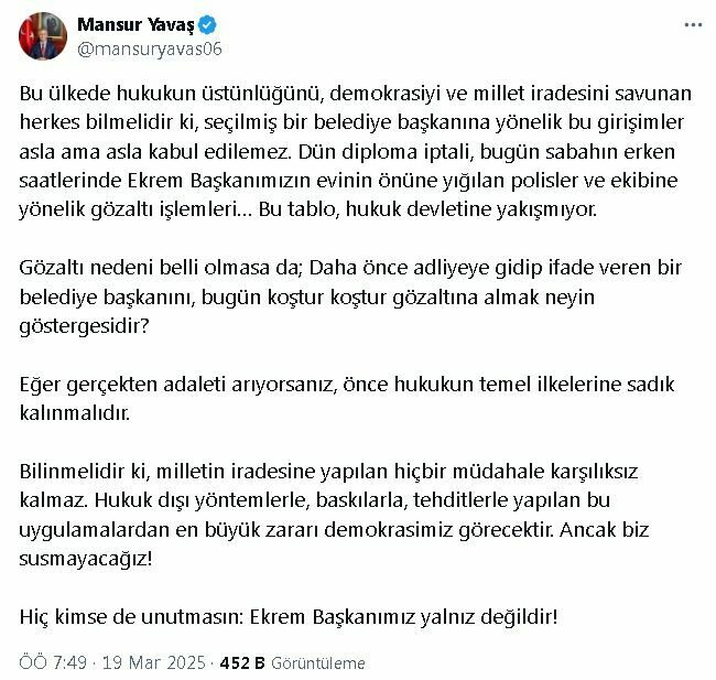 Ankara Büyükşehir Belediye Başkanı Mansur Yavaş, İstanbul Büyükşehir Belediye Başkanı Ekrem İmamoğlu’nun gözaltına alınmasına ilişkin sosyal medya hesabından yaptığı açıklamada, “Bu ülkede hukukun üstünlüğünü, demokrasiyi ve millet iradesini savunan herkes bilmelidir ki seçilmiş bir belediye başkanına yönelik bu girişimler asla ama asla kabul edilemez. Dün diploma iptali, bugün sabahın erken saatlerinde Ekrem Başkanımızın evinin önüne yığılan polisler ve ekibine yönelik gözaltı işlemleri. Bu tablo, hukuk devletine yakışmıyor. Gözaltı nedeni belli olmasa da daha önce adliyeye gidip ifade veren bir belediye başkanını, bugün koştur koştur gözaltına almak neyin göstergesidir. Eğer gerçekten adaleti arıyorsanız, önce hukukun temel ilkelerine sadık kalınmalıdır. Bilinmelidir ki milletin iradesine yapılan hiçbir müdahale karşılıksız kalmaz. Hukuk dışı yöntemlerle, baskılarla, tehditlerle yapılan bu uygulamalardan en büyük zararı demokrasimiz görecektir. Ancak biz susmayacağız. Hiç kimse de unutmasın; Ekrem Başkanımız yalnız değildir” ifadelerini kullandı. (DHA)