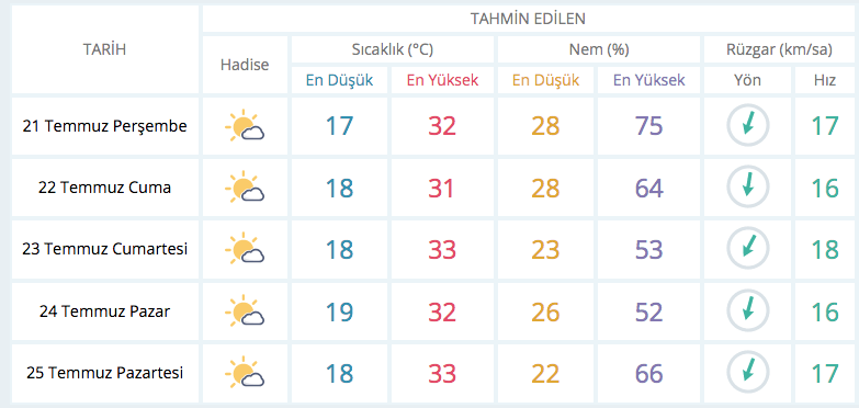 Günün en yüksek hava sıcaklıklarının 21-24 Temmuz’da Edirne’de 36-37, Kırklareli’de 33- 34 ve Tekirdağ’ın batısında (Hayrabolu, Malkara, Muratlı) 34-35 dereceler civarında seyretmesi bekleniyor.