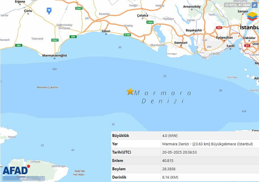 AFAD’ın internet sitesinden alınan bilgiye göre; saat 23.36’da Marmara Denizi’nde İstanbul Büyükçekmece açıklarında 4 büyüklüğünde deprem meydana geldi.
