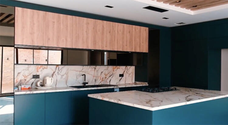 Gösterişli bir mutfağa sahip olan Güzide, tavan ışıklarından; elektrikli aletlerini koyacağı rafa kadar tüm detayları düşündüğünü anlattı. Ortada bir ada tezgah tercih eden Mertcan, evde çok sık vakit geçirdiği yerlerde koyu renk tercih ettiğini söyledi. Bu nedenle mutfakta antrasit dolaplar ve ahşap detayları kullandığı açığa çıktı.