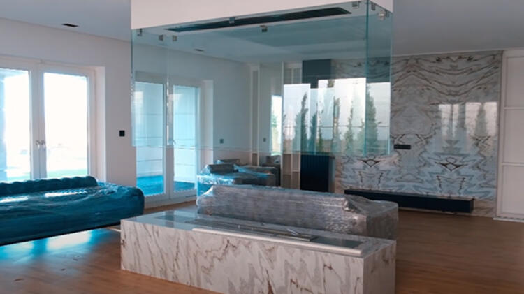 En alt kata inen Güzide, son olarak buradaki üç misafir yatak odasını, kapalı havuzu, jakuziyi ve yine ortasında şömine olan salonu gösterdi.