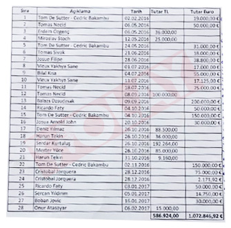 Bursaspor’un, TFF’nin açıkladığı menajer komisyonlarıyla ilgili net rakamları bu tabloda göreceksiniz… Eski dönem yapılan sözleşmelerle ilgili 908 bin 971 Euro ve 206 bin 160 lira, Ali Ay döneminde yapılan transfer için de 163 bin 875 Euro ve 380 bin 764 lira ödediği belirtiliyor… TFF, ödemelerin bu yönetim ve 2016-17 sezonu içinde yapılması nedeniyle toplam rakamı açıkladığı görülüyor.