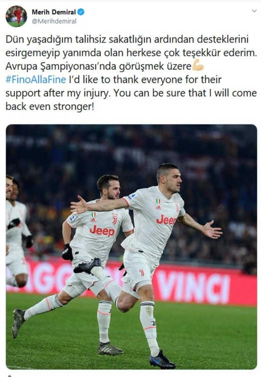 Merih Demiral sosyal medya hesabından yaptığı paylaşımda, “Dün yaşadığım talihsiz sakatlığın ardından desteklerini esirgemeyip yanımda olan herkese çok teşekkür ederim. Avrupa Şampiyonası’nda görüşmek üzere” ifadelerini kullandı.