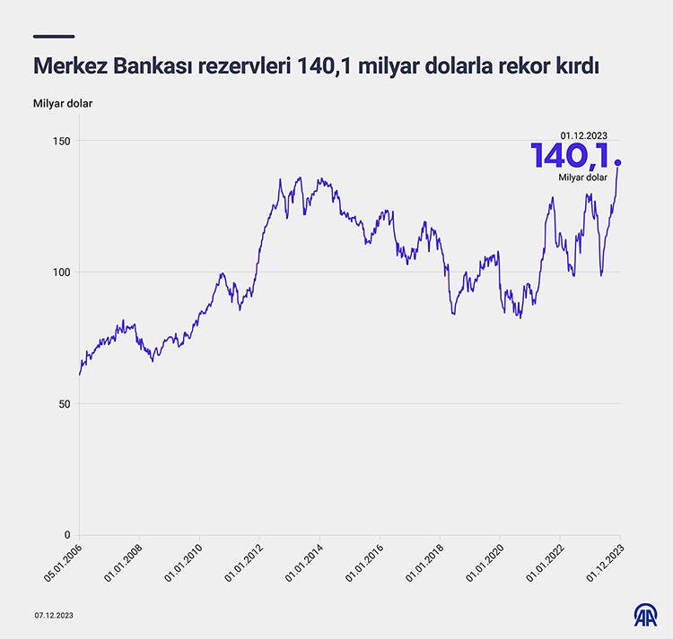Türkiye Cumhuriyet Merkez Bankası (TCMB) toplam rezervleri, 1 Aralık haftasında bir önceki haftaya göre 3 milyar 656 milyon dolar artışla 140 milyar 149 milyon dolara çıkarak tüm zamanların en yüksek seviyesine ulaştı.