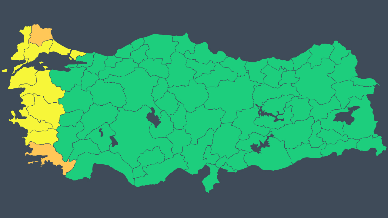 Aydın, Çanakkale, İzmir, Manisa, Tekirdağ, Balıkesir, Edirne ve Muğla’ya sarı kodlu yine Muğla ve Kırklareli’ye turuncu kodlu uyarıda bulunuldu.