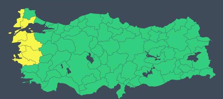 Meteoroloji 6 kente “sarı” kod uyarısı yaptı: Balıkesir, Çanakkale, Edirne, İzmir, Manisa, Tekirdağ.