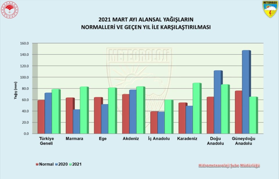 Meteoroloji Genel Müdürlüğü (MGM) verilerinden yapılan değerlendirmeye göre; Türkiye genelinde mart ayı yağışları, normalin ve geçen yıl yağışlarının üzerinde gerçekleşti.