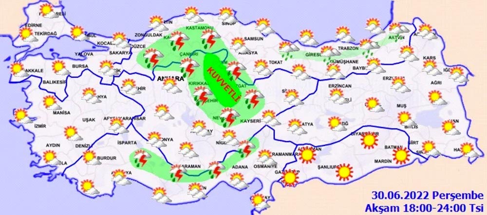 Yağışların öğleden sonra Batı Karadeniz’in iç kesimleri ve Çankırı çevreleri ile Ankara’nın merkez ve kuzey ilçelerinde, akşam saatlerinde Kırıkkale çevreleri ile Kayseri’nin kuzeyi ve Çorum ile Yozgat’ın batısında yerel kuvvetli olması tahmin ediliyor.
