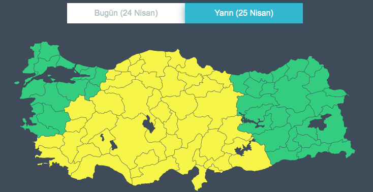 Sarı uyarı yapılan iller: Adana, Adıyaman, Afyonkarahisar, Amasya, Ankara, Antalya, Aydın, Bolu, Burdur, Çankırı, Çorum, Denizli, Eskişehir, Gaziantep, Hatay, Isparta, Mersin, Kastamonu, Kayseri, Kırşehir, Konya, Kütahya, Malatya, Kahramanmaraş, Muğla, Nevşehir, Niğde, Ordu, Samsun, Sinop, Sivas, Tokat, Şanlıurfa, Uşak, Yozgat, Zonguldak, Aksaray, Karaman, Kırıkkale, Bartın, Karabük, Kilis, Osmaniye ve Düzce.