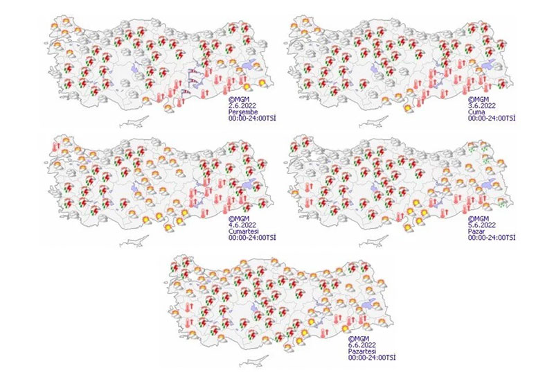 Meteoroloji Genel Müdürlüğü’nün (MGM) yayınladığı 5 günlük hava tahmini grafikleri. Meteoroloji Genel Müdürlüğü’nün (MGM) yayınladığı 5 günlük hava tahmini grafikleri.
