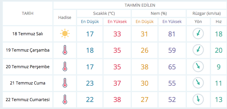 İstanbul’da hava sıcaklığının yarın 31 derece, cuma ise 35 dereye kadar yükseleceğini söyleyen Tekin, “İzmir’de hava sıcaklığı bir hayli yüksek. Yarın 32 derece olan hava sıcaklığı, hafta sonuna doğru 40 derecelere yaklaşacak. Önümüzdeki 3 gün boyunca kuzeyli yönlerden rüzgar kuvvetli esecek. Denizcilerimizin tedbirli olmalarını istemekteyiz.” diye konuştu.