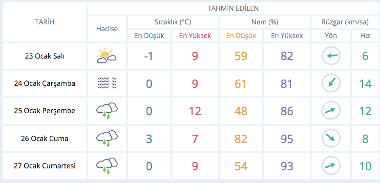 Perşembe gününden itibaren ise yağış geliyor. Sıcaklık en düşük 0, en yüksek ise 12 derece.