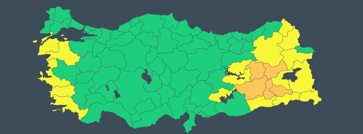 SARI VE TURUNCU KODLA UYARI YAPILAN KENTLER: Ağrı, Aydın, Balıkesir, Bingöl, Bitlis, Çanakkale, Diyarbakır, Elazığ, Erzurum, Hakkari, İzmir, Kars, Mardin, Muğla, Muş, Siirt, Dersim, Van, Batman, Şırnak ve Ardahan.