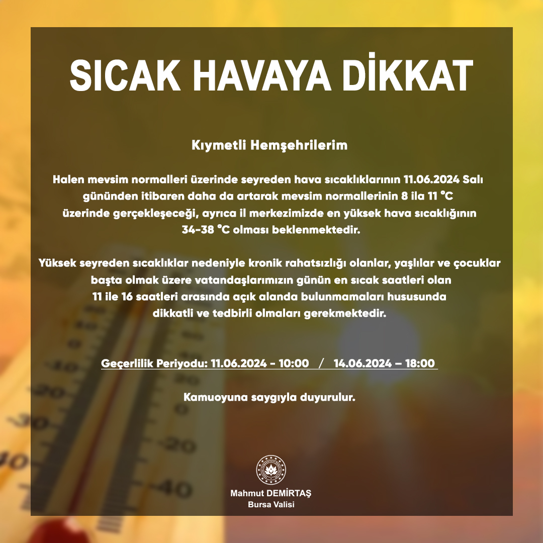 Yüksek seyreden sıcaklıklar nedeniyle, kronik rahatsızlığı olanlar, yaşlılar ve çocuklar başta olmak üzere vatandaşlarımızın günün en sıcak saatleri olan 11 ile 16 saatleri arasında açık alanda bulunmamaları hususunda dikkatli ve tedbirli olmaları gerekmektedir.”