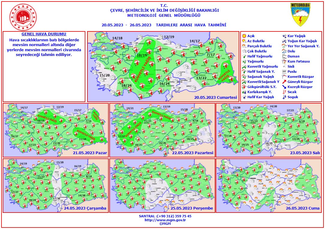 Ülkemiz genelinin parçalı ve çok bulutlu, Marmara, Kuzey ve İç Ege, Akdeniz, İç Anadolu, Batı ve Orta Karadeniz’in iç kesimleri, Doğu Karadeniz, (Malatya hariç) Doğu Anadolu ile Güneydoğu Anadolu’nun doğusunun sağanak ve gök gürültülü sağanak yağışlı geçeceği tahmin ediliyor. Yağışların Batı Karadeniz’in iç kesimleri, Ankara, Kırıkkale, Konya, Karaman, Aksaray, Nevşehir, Niğde, Çankırı ve Hakkari ile Isparta’nın doğu çevrelerinde yerel kuvvetli olması bekleniyor. Doğu Anadolu’nun güneydoğusunda toz taşınımı görüleceği tahmin ediliyor.