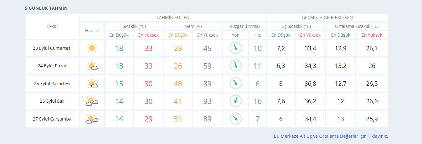 Öte yandan Meteoroloji Genel Müdürlüğü, sosyal medya hesabından 23-29 Eylül 2023 arası haftalık hava tahminini paylaştı. Meteoroloji’nin paylaşımında “Hava sıcaklıklarının; güney, iç ve batı bölgelerde mevsim normallerinin 3 ila 6 derece üzerinde; diğer yerlerde mevsim normalleri civarında seyretmesi bekleniyor” ifadeleri yer aldı.