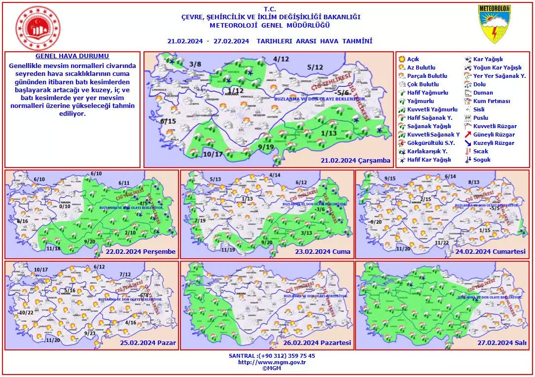 Doğu Anadolu’nun güneydoğusunun yükseklerinde yer yer karla karışık yağmur ve kar yağışlı geçeceği tahmin ediliyor. Doğu Karadeniz’in iç kesimleri ile Doğu Anadolu’nun kuzey ve doğusunun kar örtüsüne sahip eğimli yamaçlarında çığ tehlikesi bulunmakta…