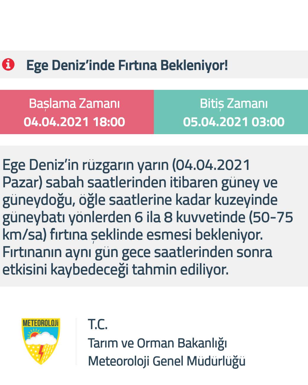 Meteoroloji Genel Müdürlüğü’nün son dakika açıklamasına göre; yarın sabahtan itibaren Ege Denizi’nde fırtına bekleniyor…
