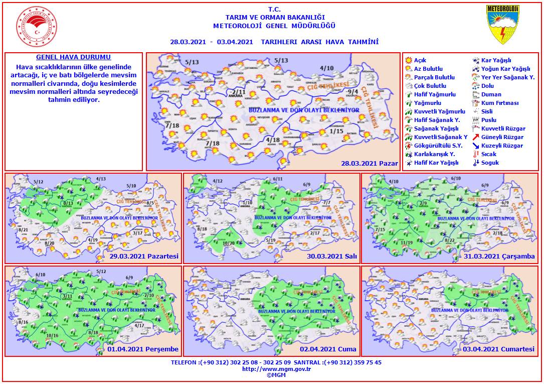 Haftalık Hava Durumu (28 Mart – 3 Nisan 2021) Hava sıcaklıklarının ülke genelinde artacağı, iç ve batı bölgelerde mevsim normalleri civarında, doğu kesimlerde mevsim normalleri altında seyredeceği tahmin ediliyor.