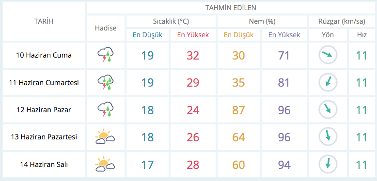 12.06.2022 Pazar: Ülkemiz genelinin parçalı ve çok bulutlu, Marmara, İç Ege, Akdeniz’in iç kesimleri, İç Anadolu, Karadeniz, Doğu Anadolu’nun kuzey ve doğusu ile Bingöl ve Muş çevrelerinin yerel olmak üzere sağanak ve gök gürültülü sağanak yağışlı geçeceği tahmin ediliyor. Rüzgârın Doğu ve Güneydoğu Anadolu’da güneyli yönlerden kuvvetli (40-60 km/saat) olarak esmesi bekleniyor.