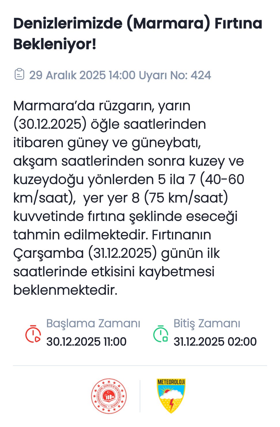 Marmara’da rüzgarın, yarın (30.12.2025) öğle saatlerinden itibaren güney ve güneybatı, akşam saatlerinden sonra kuzey ve kuzeydoğu yönlerden 5 ila 7 (40-60 km/saat), yer yer 8 (75 km/saat) kuvvetinde fırtına şeklinde eseceği tahmin edilmektedir. Fırtınanın Çarşamba (31.12.2025) günün ilk saatlerinde etkisini kaybetmesi beklenmektedir.