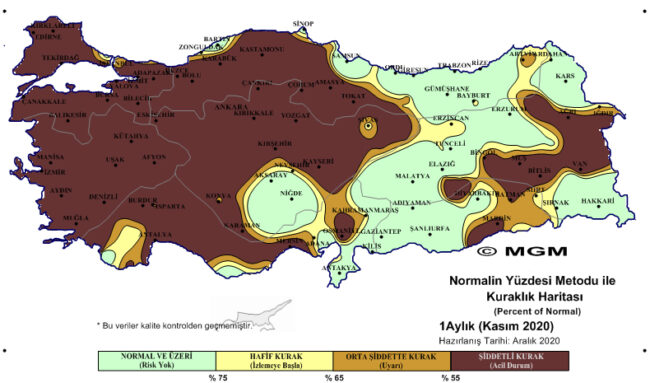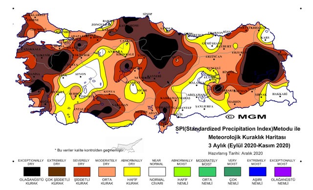 Meteoroloji Genel Müdürlüğü, Standart Yağış İndeksi (SPI – Standardized Precipitation Index) metoduna göre 2020 Eylül-Ekim-Kasım ayları meteorolojik kuraklık analizi ve Normalin Yüzdesi (PNI – Percent of Normal Index) metoduna göre, son üç aylık ve 2020 Kasım ayı meteorolojik kuraklık durumuna ilişkin haritalar yayımlandı.
