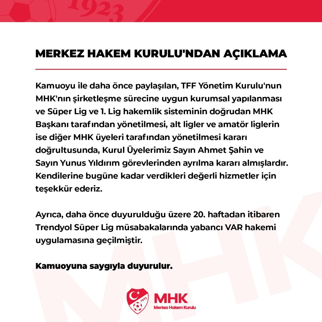 “Kamuoyu ile daha önce paylaşılan, TFF Yönetim Kurulu’nun MHK’nın şirketleşme sürecine uygun kurumsal yapılanması ve Süper Lig ve 1. Lig hakemlik sisteminin doğrudan MHK Başkanı tarafından yönetilmesi, alt ligler ve amatör liglerin ise diğer MHK üyeleri tarafından yönetilmesi kararı doğrultusunda, Kurul Üyelerimiz Sayın Ahmet Şahin ve Sayın Yunus Yıldırım görevlerinden ayrılma kararı almışlardır. Kendilerine bugüne kadar verdikleri değerli hizmetler için teşekkür ederiz.
