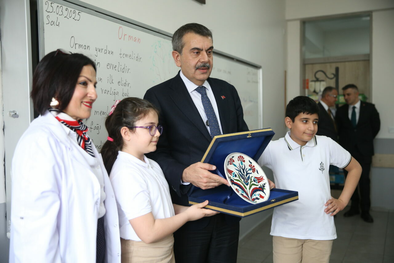 Öğrenciler de Bakan Tekin’e hediye takdiminde bulundu. (AA)