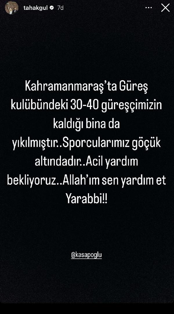 Akgül, “Kahramanmaraş’ta güreş kulübündeki 30-40 güreşçimizin kaldığı bina da yıkılmıştır… Sporcularımız göçük altındadır. Acil yardım bekliyoruz. Allah’ım sen yardım et yarabbi!” paylaşımında bulundu.