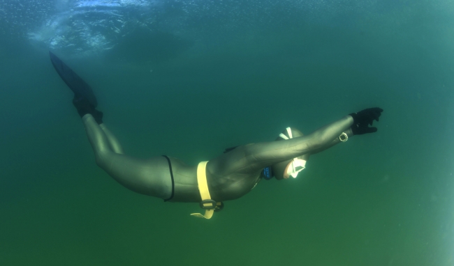 Milli dalış sporcusu Birgül Erken, Sivas’ta, kentin en büyük gölü olan ve ‘kuş cenneti’ olarak da bilinen Tödürge Gölü’nde ‘Dünya Kadınlar Günü’ dolayısıyla dalış gerçekleştirdi.