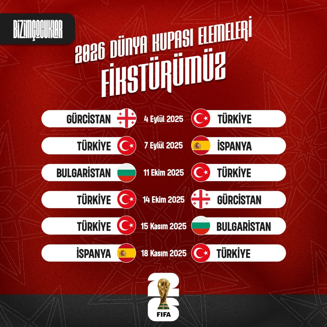 Ana Sayfa › Final › Futbol › Milli Takım’ın Dünya Kupası Elemeleri’ndeki fikstürü açıklandıMilli Takım’ın Dünya Kupası Elemeleri’ndeki fikstürü açıklandı A Millî Takımımızın, 2026 Dünya Kupası Elemeleri’ndeki fikstürü belli oldu. Giriş: 24-03-2025 14:03Güncelleme: 26-03-2025 13:24Kaynak: HABER MERKEZİ FutbolFinal ABONE OL + - HABERİ PAYLAŞ