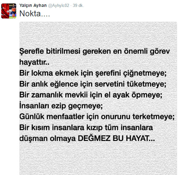 Deneyimli savunma oyuncusu, Can Yücel’in “Şerefle bitirilmesi gereken en asil görev hayattır. Bir lokma ekmek için şerefini çiğnetmeye; bir anlık eğlence için servetini tüketmeye,bir zamanlık mevkii için el ayak öpmeye ,insanları ezip geçmeye, günlük menfaatler için onurunu terk etmeye, bir kısım insanlara kızıp tüm insanlara düşman olmaya değmez bu hayat!” sözlerini paylaşarak altına ‘Nokta’ notunu düştü.