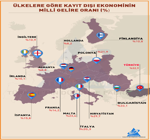 Kayıt dışı ekonominin boyutlarıyla ilgili yapılan son araştırmalarda Kayıtdışı/ Milli Gelir Oranı %32,9 ile en yüksek ülkelerin başında geliyor .Bu oran İngiltere’de %10,9,Almanyada 8,8,Fransada %14,2.