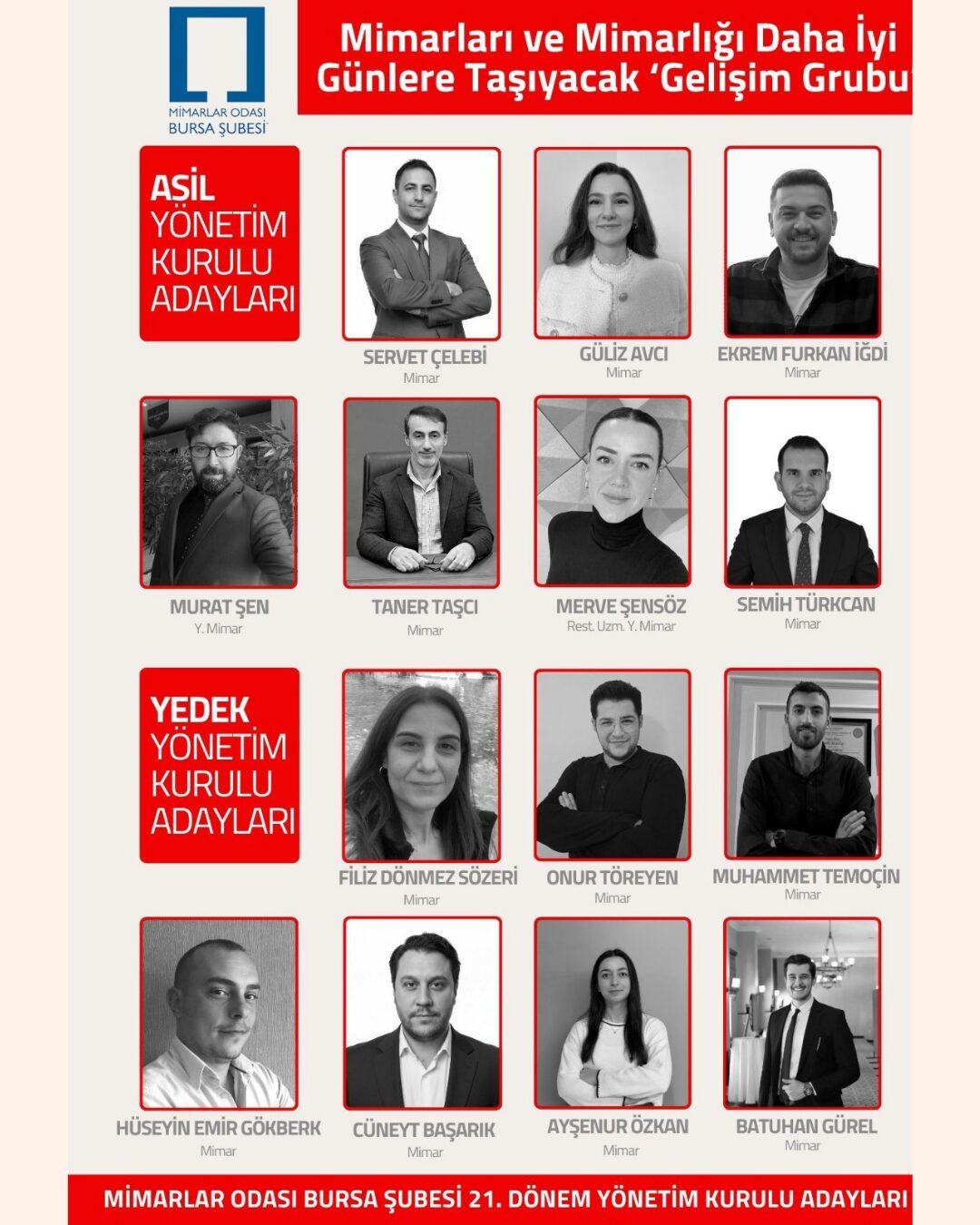 Mimarlar Odası Bursa Şubesi Gelişim Grubu’nun yönetim kurulu aday listesi şu isimlerden oluştu: