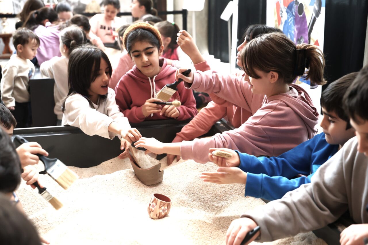 Burada Bursa’nın yüzlerce yıl önceki haliyle ilgili bilgiler edinen öğrenciler, ardından o döneme ait bardak, çanak ve sikkelerin replikalarını toprak altından fırçalar yardımıyla arkeolojik yöntemlerle çıkarmayı öğrendi. Kazı çalışmasının ardından kil atölye çalışmasına da katılan çocuklar, hayal ettikleri bir objeyi tasarladı.